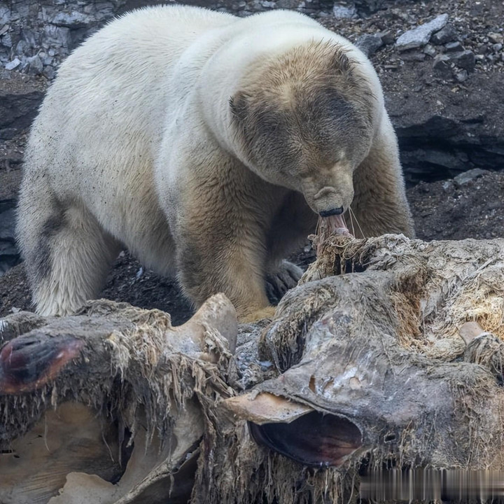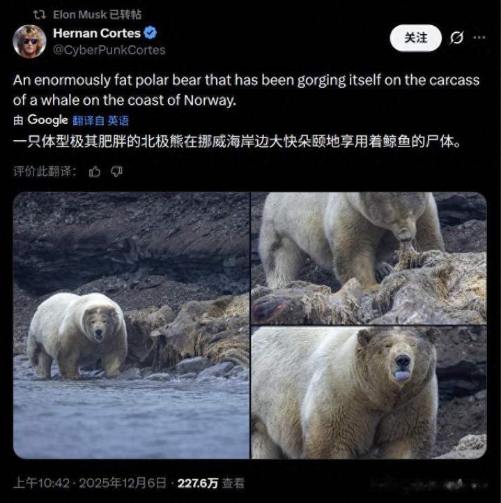 在挪威斯瓦尔巴群岛的寒冷却海岸,一张推文如病毒般席卷X平台:一只“超级胖”北极熊正大快朵颐搁浅鲸鱼尸体。@CyberPunkCortes于12月6日发布的三张照片,捕捉到这头巨兽的“饕餮”时刻——第一张中,它矗立浅滩,张开血盆大口,厚实白毛下隐现层层脂肪,宛如健身房的“bulk王”;第二张,它爪抓腐肉,低头撕咬灰鲸残躯,满足而专注;第三张特写其疲惫却餍足的脸庞,舌尖犹带血渍,眼神透着原始的野性满足。短短一天,帖文收获4.4万点赞、3千转发,浏览超200万。